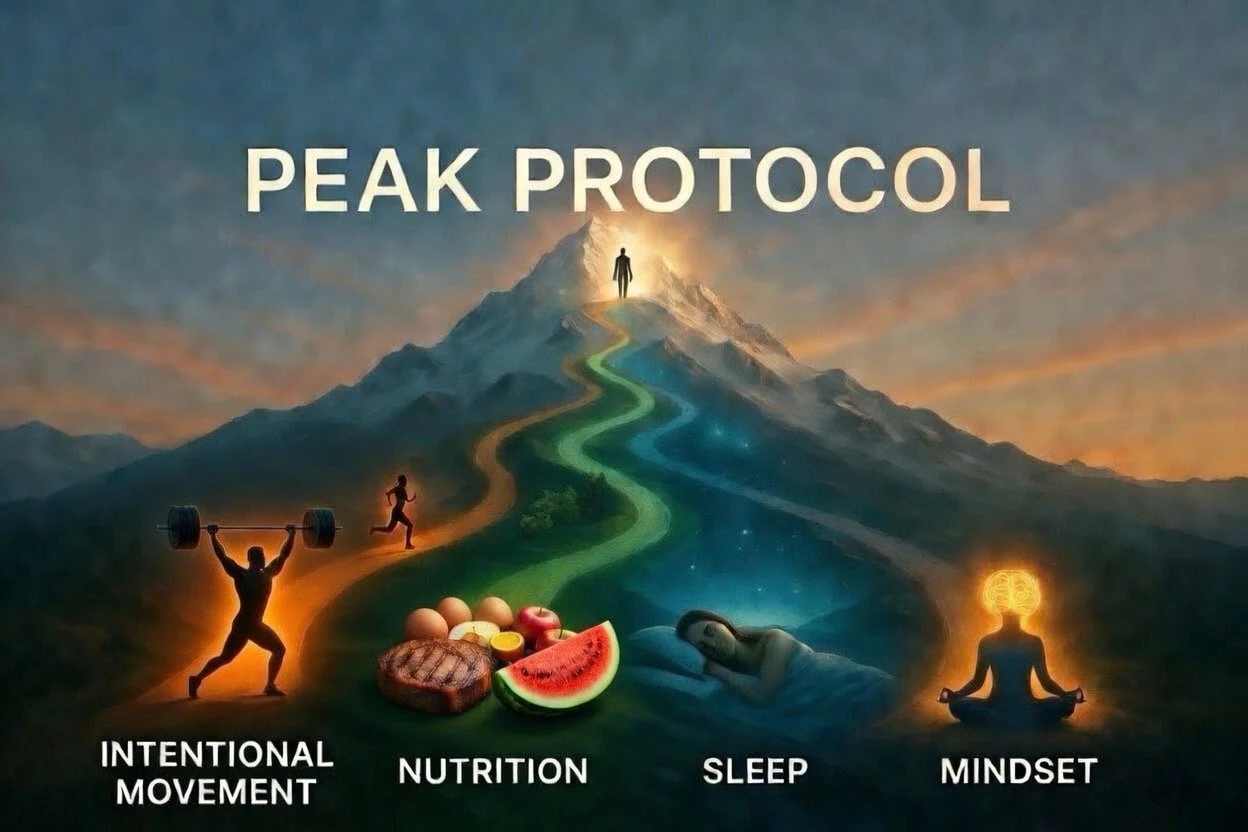 The Peak Protocol is a comprehensive, evidence-based lifestyle program designed to help everyday people achieve and maintain elite fitness and physique without upending their careers, family time, or hobbies. Structured around four interconnected pillars: Exercise/Intentional Movement (featuring a scalable strength and muscle-building program plus supplemental activity), Diet/Hydration (practical nutrition and hydrating strategies), Sleep (optimized recovery routines), and Balance/Mindset/Mental Health (tools for stress management and sustainable motivation). It offers progressive levels from Beginner (low-intensity starters for easy consistency) to Intermediate and Advanced (intensified protocols with customization). Backed by peer reviewed research, it challenges traditional health and fitness myths. No crazy supplement/peptide stack or unsustainable cold plunge/sauna/workout routine. This system emphasizes efficient and flexible habits that build lasting results, ensuring you reach your peak while keeping life in sync.